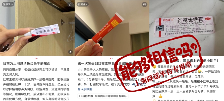 社交平台上,除了“痔疮膏祛黑眼圈”“小檗碱和中成药减肥”等“偏方”,还传播着不少药品“神用途”:红霉素软膏被称为“万能膏”,有博主推荐用来涂脸治痤疮、抹鼻子治鼻炎、涂嘴唇治干裂等;口服抗生素被当作“消毒剂”,包括“阿莫西林洗头防脱发”“阿莫西林溶液拖地消毒”“头孢粉末涂伤口杀菌”等。